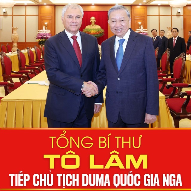 Nhắc lại những kỷ niệm và ấn tượng hết sức tốt đẹp về chuyến thăm chính thức Nga vào tháng 5/2025, cũng như các cuộc hội đàm, trao đổi chân thành, cởi mở và tin cậy cao với Tổng thống Nga Putin và các Nhà lãnh đạo cấp cao Nga, Tổng Bí thư khẳng định, chuyến thăm của Chủ tịch Duma Quốc gia Quốc hội Nga Vyacheslav Volodin là minh chứng sinh động cho ý chí và quyết tâm thúc đẩy hơn nữa quan hệ hữu nghị truyền thống và Đối tác chiến lược toàn diện Việt Nam - Nga.