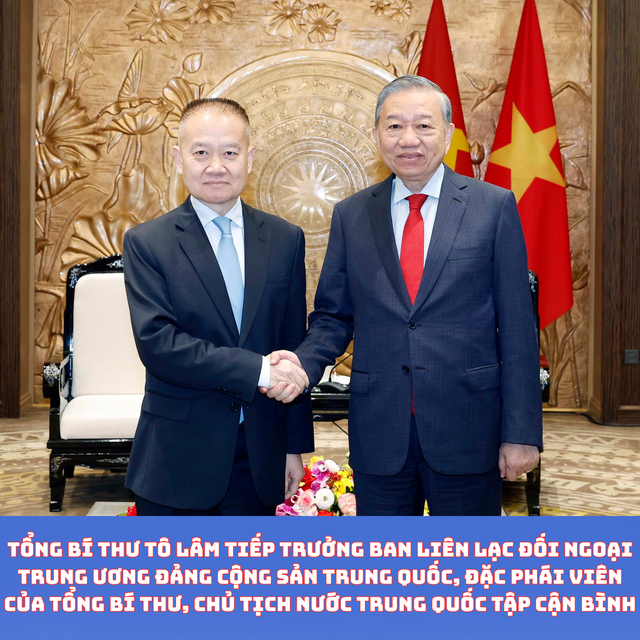 Sáng 30/1, tại Trụ sở Trung ương Đảng, Tổng Bí thư Tô Lâm đã tiếp đồng chí Lưu Hải Tinh, Ủy viên Trung ương Đảng, Trưởng Ban Liên lạc Đối ngoại Trung ương Đảng Cộng sản Trung Quốc, Đặc phái viên của Tổng Bí thư, Chủ tịch nước Trung Quốc Tập Cận Bình sang thăm và chúc mừng thành công của Đại hội đại biểu toàn quốc lần thứ XIV của Đảng Cộng sản Việt Nam.