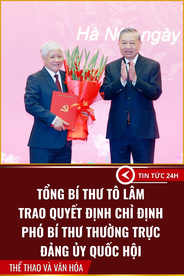 Tổng Bí thư Tô Lâm trao Quyết định của Bộ Chính trị phân công, chỉ định đồng chí Đỗ Văn Chiến giữ chức Phó Bí thư Thường trực Đảng uỷ Quốc hội. Ảnh: Thống Nhất - TTXVN