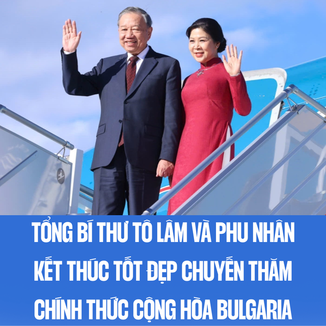 Sáng 25/10, chuyên cơ chở Tổng Bí thư Tô Lâm và Phu nhân cùng Đoàn đại biểu cấp cao Việt Nam đã về đến sân bay quốc tế Nội Bài (Thủ đô Hà Nội) kết thúc tốt đẹp chuyến thăm chính thức Cộng hòa Bulgaria từ ngày 22 - 24/10/2025, theo lời mời của Tổng thống Cộng hòa Bulgaria Rumen Radev.