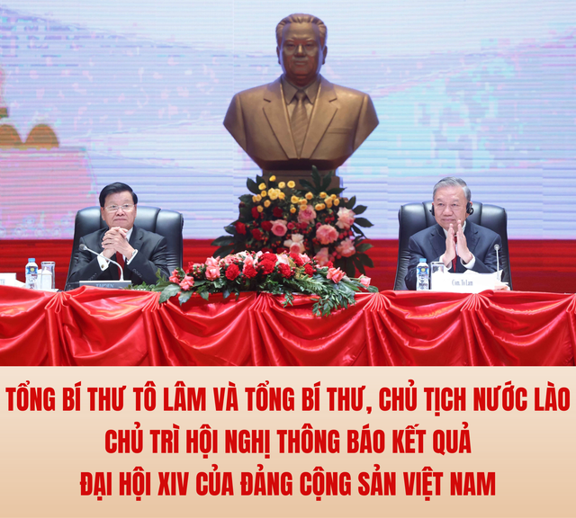 Sáng 5/2/2026, tại Thủ đô Vientiane, Tổng Bí thư Tô Lâm và Tổng Bí thư, Chủ tịch nước Lào Thongloun Sisoulith chủ trì Hội nghị thông báo kết quả Đại hội đại biểu toàn quốc lần thứ XIV Đảng của Cộng sản Việt Nam.