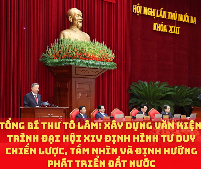 Về Dự thảo các văn kiện Đại hội XIV, Tổng Bí thư cho biết, Dự thảo Văn kiện Đại hội XIV đã được chuẩn bị công phu, kỹ lưỡng, cập nhật, chỉnh lý, bổ sung nhiều lần, nhất là những nội dung đã được nhất trí thông qua tại Hội nghị Trung ương 11 và Hội nghị Trung ương 12. Nội dung các Văn kiện cơ bản đã đáp ứng yêu cầu để trình Đại hội Đại biểu toàn quốc lần thứ XIV của Đảng. Phấn đấu xây dựng văn kiện trình Đại hội XIV không chỉ tổng kết chặng đường phát triển 5 năm qua, xác định mục tiêu, nhiệm vụ trong 5 năm tới mà còn định hình tư duy chiến lược, tầm nhìn và định hướng phát triển đất nước đến giữa thế kỷ XXI.