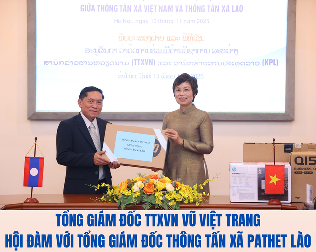 Sáng 13/11/2025, tại Trung tâm Thông tấn Quốc gia, số 5 Lý Thường Kiệt (Hà Nội), Tổng Giám đốc Thông tấn xã Việt Nam (TTXVN) Vũ Việt Trang hội đàm với Tổng Giám đốc Thông tấn xã Pathet Lào (KPL) Vannasin Simmavong.